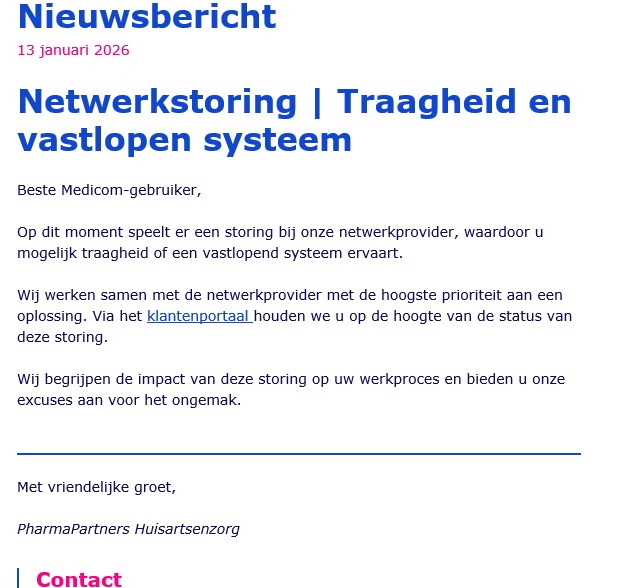 HuisartsInformatieSystemen(HIS-sen) zijn de ICT-basis waarop alle huisartspraktijken in Nederland hun werk doen. Vanmorgen, 13 januari raakten een flink aantal huisartspraktijken, die werken met Medicom(van het bedrijf PharmaPartners) als HIS bij het opstarten verrast door een netwerkstoring bij de netwerkprovider waar Medicom mee draait. Dat betekent dat het Medicom-systeem mogelijk trager dan gebruikelijk werkte of geheel vastliep. Daardoor restte alleen nog maar werken met pen en papier. PharmaPartners lichtte de Medicom gebruikende huisartspraktijken in de loop van de ochtend per email in. HIS-sen vormen tegenwoordig zo’n essentieel onderdeel uit van de dagelijkse praktijkvoering dat elke onderbreking bijzonder grote hinder oplevert. De agendafunctie, het vastleggen van wat er tijdens consulten/visites/telefonisch overleg gebeurt is bij zo’n storing niet meer mogelijk. Het elektronisch voorschrijven door huisartsen met het digitaal versturen van de recepten naar de apotheek valt ook weg.