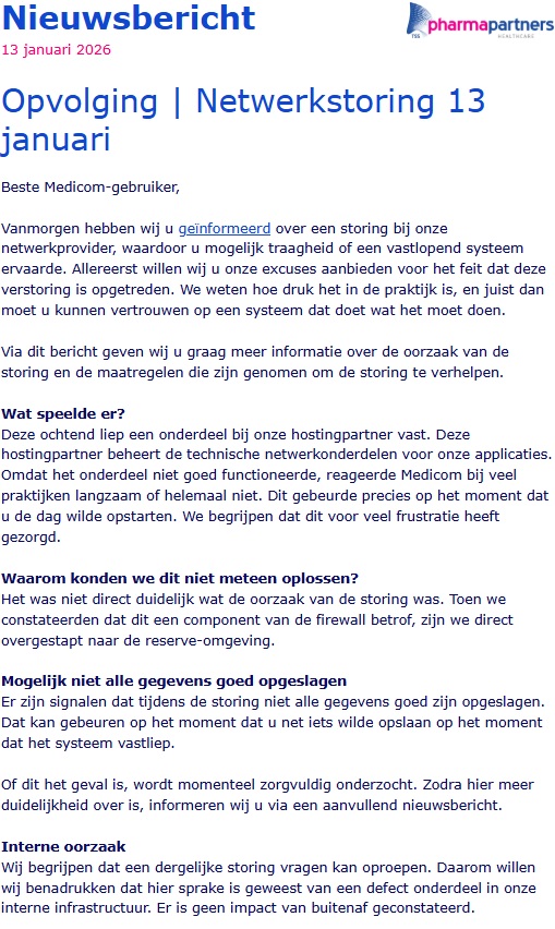 Uit een nader bericht dat PharmaPartners in de vooravond naar de gebruikers stuurde blijkt dat naar hun zeggen een onderdeel bij de hosting-partner vastliep. Die hostingpartner beheert de technische netwerkonderdelen voor de Medicom-applicaties. Uit het nadere bericht blijkt dat het onderdeel dat niet goed werkte een component van de firewall betrof. Of het een software-, update-fout dan wel een misconfiguratie van de firewall was vermeldt men niet.  Het heeft even geduurd voor men door had waar precies het probleem zat. PharmaPartners heef toen besloten om direct over te stappen op een reserve-omgeving